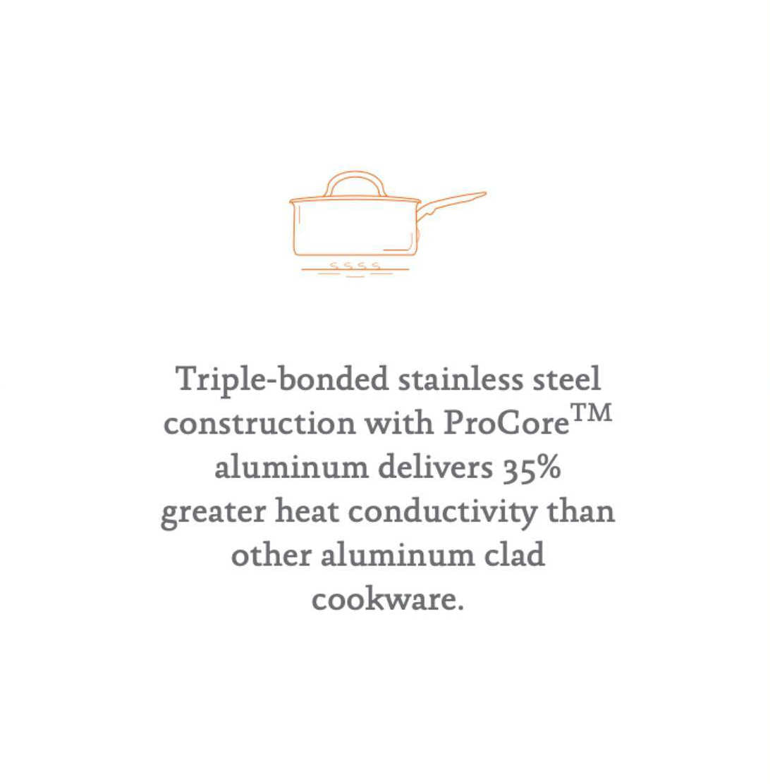 - Triple bonded stainless steel with exclusive ProCoreTM aluminum delivers 35% greater heat conductivity than other aluminum-clad cookware for quick and even heating