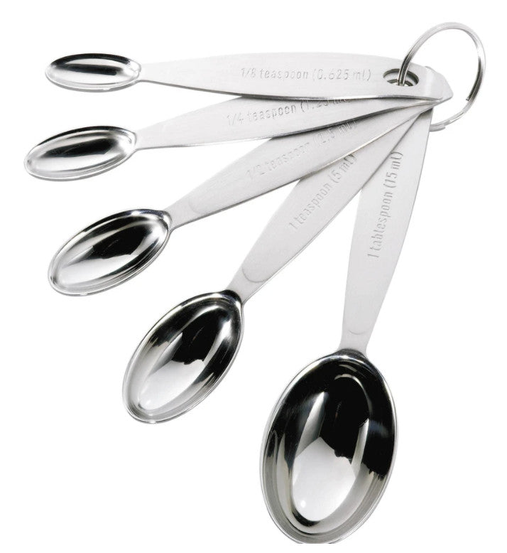 Recommended by professionals, our innovative set of five measuring spoons that fit together neatly and are held together with a simple storage clip. These superb nesting measuring spoons are oval to reach into the smallest spice jar. The gently curved handles curl under, so the spoons can sit securely on the counter without tipping over.